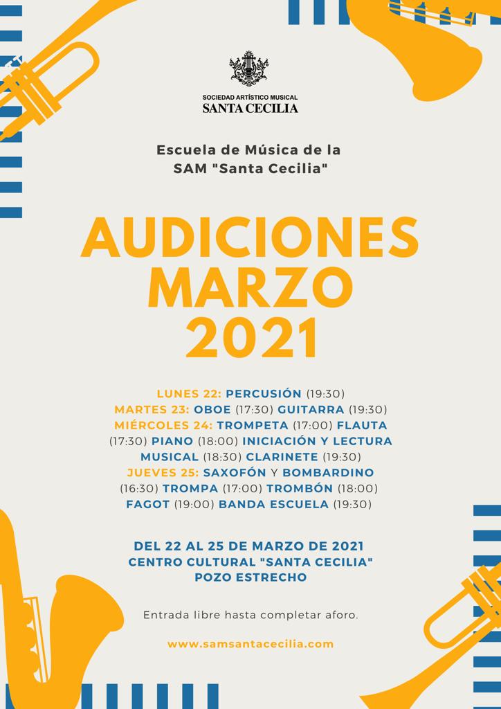 < Volver Audiciones marzo 2021 Del 22 al 25 de marzo en el Centro Cultural "Santa Cecilia" Entrada libre hasta completar aforo.
