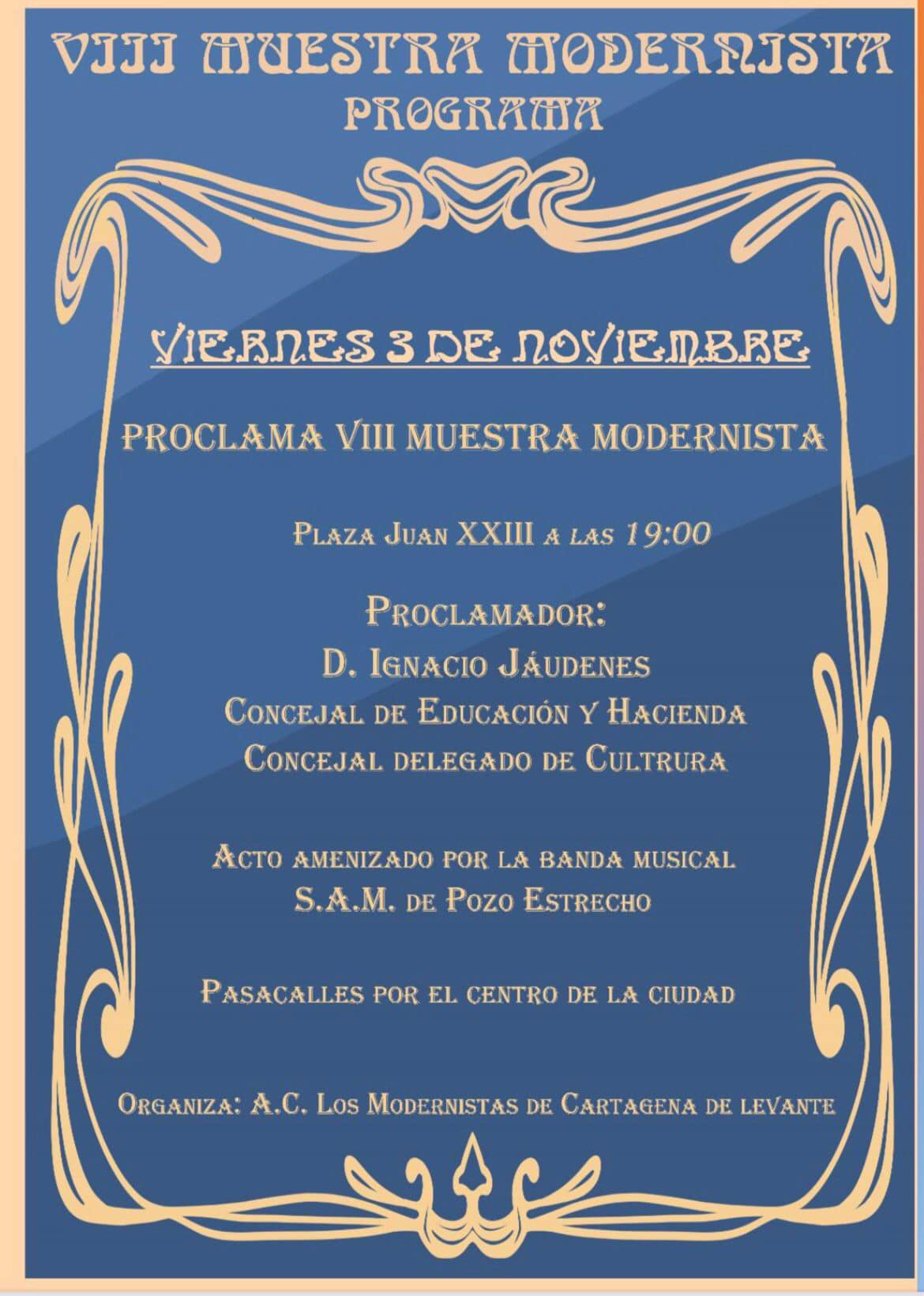 Os esperamos hoy en la Plaza Juan XXII a las 19:00h, donde tendrá lugar la Proclama de la VIII Muestra Modernista Cartagena de Levante.
