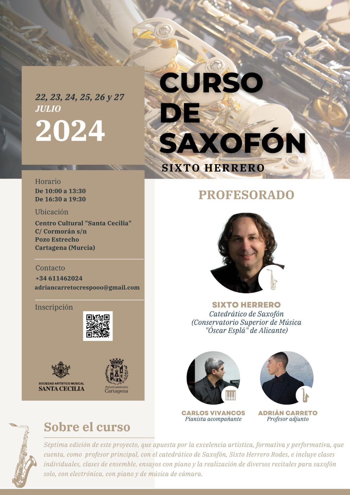 Curso de Saxof贸n impartido por Sixto Herrero del 22 al 27 de julio en nuestra escuela.