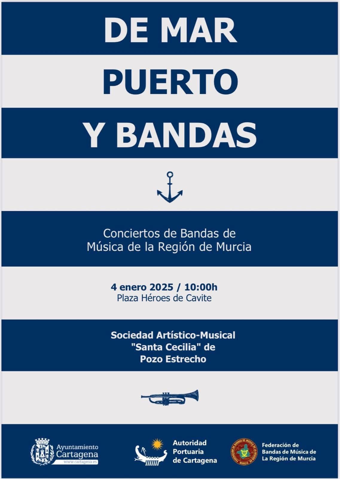 Este sábado, 4 de enero a las 10:00h, estaremos en la Plaza Héroes de Cavite de Cartagena realizando nuestro concierto enmarcado en el ciclo de conciertos “De mar, puerto y bandas” organizado por la Federación de Bandas de la Región de Murcia.