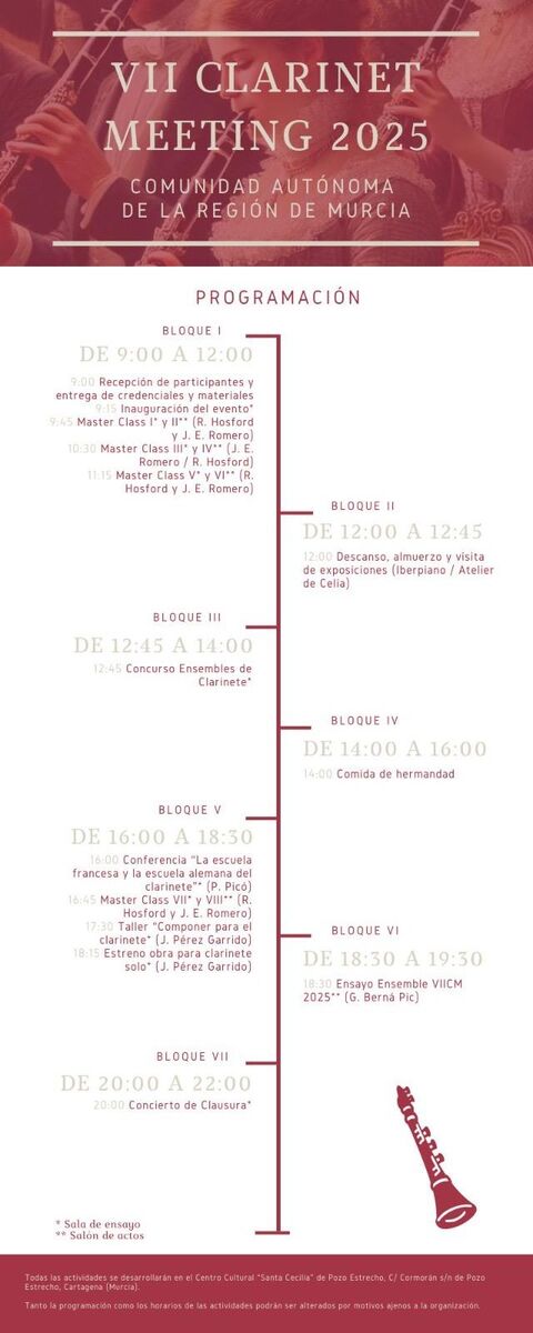 < Volver Programa del VII Clarinet Meeting 2025 La VII edición del Clarinet Meeting se celebrará el 15 de noviembre en Pozo Estrecho Conoce el programa de actividades de esta edición.
